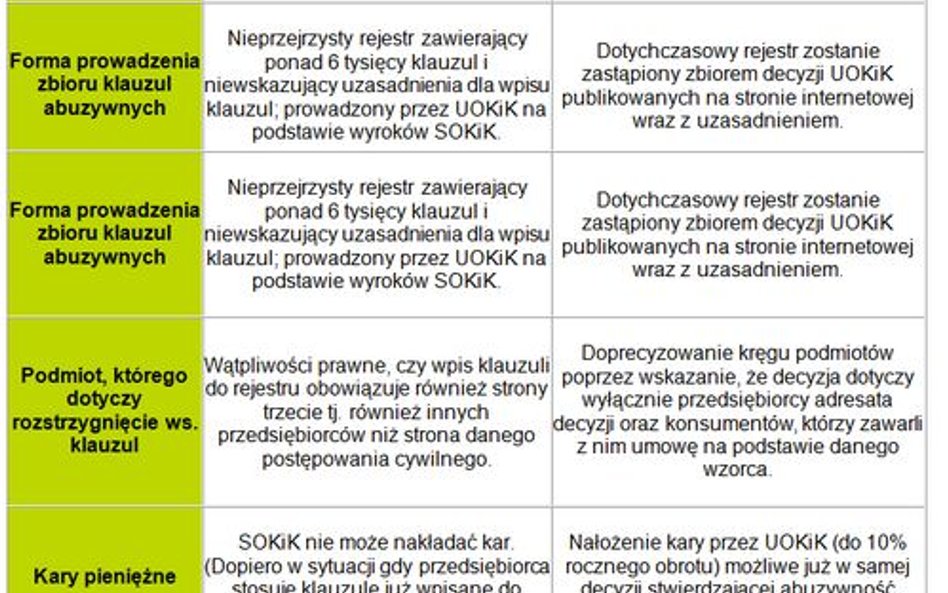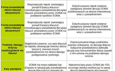 Najistotniejszą zmianą z punktu widzenia przedsiębiorców jest kompetencja organu do nakładania kary już w decyzji stwierdzającej abuzywność danej klauzuli. Dotychczas UOKiK mógł nałożyć karę dopiero kiedy przedsiębiorca stosował niedopuszczalne klauzule, mimo iż były one wpisane do publicznego rejestru na mocy rozstrzygnięcia sądu wydanego w efekcie kontradyktoryjnego procesu. W odniesieniu do klauzul wpisanych do dotychczasowego rejestru UOKiK będzie mógł jeszcze przez 10 lat orzekać o naruszeniu zbiorowych interesów konsumentów na podstawie dotychczasowych przepisów. UOKIK w decyzji może nałożyć środki usunięcia trwających skutków naruszeń. Nakładanie takich środków, przykładowo obowiązku aneksowania umów, jest ingerencją w relacje cywilnoprawne, ale z drugiej strony może przyczyniać się do zwiększenia pewności prawnej po stronie przedsiębiorców i konsumentów, umożliwiając, np. zastąpienie bezskutecznej klauzuli, klauzulą zgodną z prawem.