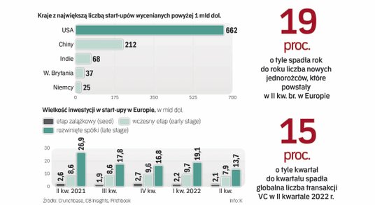 Po pandemicznymi boomie na innowacje, gdy do młodych firm tworzących nowatorskie technologie płynął szeroki strumień pieniędzy od inwestorów, nie ma już śladu. Od początku roku widać ostre hamowanie w branży innowacji – globalnie wartość inwestycji w takie projekty nurkuje już drugi kwartał z rzędu. Wedle danych CB Insights w II kwartale spadki sięgnęły aż 23 proc. To drugie pod względem wielkości tąpnięcie od dekady. Z analiz Crunchbase wynika, że w Europie sytuacja jest szczególnie niewesoła – tu redukcja w II kwartale sięgnęła aż 38 proc. Powstaje ponadto mniej jednorożców. W szczycie ub.r. kwartalnie na świecie przybywało niemal 150 młodych, innowacyjnych firm, których wartość sięga minimum 1 mld dol. Obecnie to już tylko nieco ponad 80. Do tego, coraz więcej podmiotów, które miało ów status, traci miano „unicorna”.