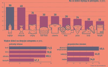 Dzieci decydują o wydatkach domowych, ale dysponują też własnym budżetem w postaci kieszonkowego. Najmłodsi Polacy stanowią więc całkiem poważną grupę konsumentów. W sumie dzieci w wieku od 3 do 16 lat jest ok. 5 mln. Mają do dyspozycji aż 5 mld zł rocznie. Pieniądze z kieszonkowego głównie przejadają – największa grupa wydaje je na słodycze czy napoje. W czołówce potrzeb finansowych są także wyjścia z rówieśnikami – od lokali typu fast food po wizyty w kinie. Jednak już 49 proc. najmłodszych oszczędza z myślą o poważniejszych wydatkach, głównie na komputer czy smartfon.