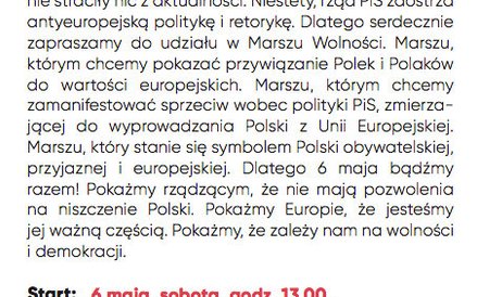 Schetyna pisze na niej m.in. „[Marsz] stanie się symbolem Polski obywatelskiej, przyjaznej i europejskiej. Dlatego 6 maja bądźmy razem! Pokażmy rządzącym, ze nie maja pozwolenia na niszczenie Polski”.