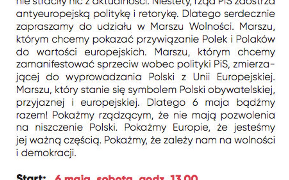 „Serdecznie zapraszamy do udziału w Marszu Wolności. Marszu, którym chcemy pokazać przywiązanie Polek i Polaków do wartości europejskich. Marszu, którym chcemy zamanifestować sprzeciw wobec polityki PiS, zmierzającej do wyprowadzania Polski z Unii Europejskiej” – pisze lider PO Grzegorz Schetyna w specjalnej ulotce przygotowanej przez partię, do której dotarła „Rzeczpospolita”.