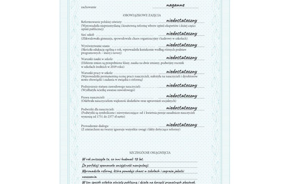 Związek Nauczycielstwa Polskiego na koniec roku szkolnego przygotował świadectwo dla minister edukacji Anny Zalewskiej.