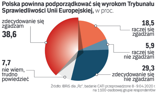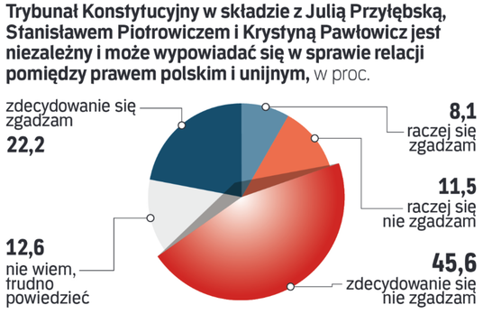 W sondażu przeprowadzonym przez IBRiS na zlecenie „Rzeczpospolitej" zapytaliśmy o reakcje na orzeczenie Trybunału w sprawie wyższości prawa UE nad krajowym. Pierwsze pytanie dotyczyło legitymacji, którą ma do wydawania tego fundamentalnego rozstrzygnięcia TK. Ze stwierdzeniem, że „TK w składzie z Julią Przyłębską, Stanisławem Piotrowiczem i Krystyną Pawłowicz jest niezależny i może wypowiadać się w sprawie relacji pomiędzy prawem polskim i unijnym", zgadza się 30 proc. badanych, 57 proc. się nie zgadza, a 13 proc. – nie wie.