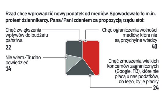 IBRiS na zlecenie „Rzeczpospolitej" zapytał respondentów, jaki cel chciał osiągnąć rząd, wprowadzając nowy podatek od mediów. Zapowiedź ta spowodowała m.in. protest dziennikarzy oskarżających rządzących o próbę wprowadzenia cenzury.