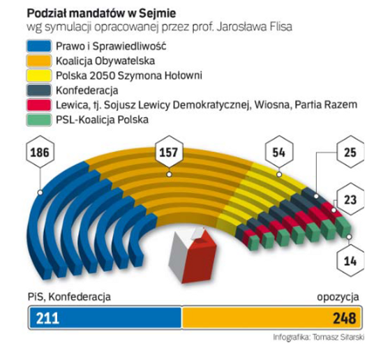Według symulacji opracowanej dla „Rz" przez prof. Jarosława Flisa, socjologa z Uniwersytetu Jagiellońskiego, oznacza to, że PiS może liczyć na 186 mandatów, a PO – na 157. Ale zdolność do sprawowania władzy w tym układzie nie zależy od indywidualnego wyniku, tylko od możliwości koalicyjnych. Platforma może liczyć po wyborach na Polskę 2050, która otrzymuje poparcie 11,1 proc., co przekłada się na 54 mandaty, do Sejmu weszłoby też PSL z poparciem 5,2, co daje ludowcom 14 mandatów. Swój klub miałaby także Lewica otrzymująca 6,6 proc., czyli 23 mandaty. Razem: 248 mandatów dla opozycji. Warto podkreślić, że wynik ten dotyczy startu każdej partii osobno, a nie wspólnej opozycyjnej listy.