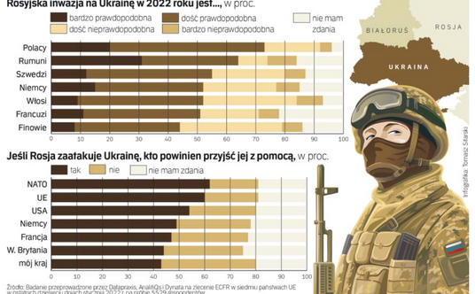 Najbardziej pesymistyczni są Polacy. European Council on Foreign Relations (ECFR) poprosił o ocenę kryzysu na wschodzie mieszkańców naszego kraju, a także Niemiec, Francji, Włoch, Szwecji, Finlandii i Rumunii. Wynika z niej, że aż 73 proc. z nas spodziewa się w 2022 r. inwazji na Ukrainę. To wyraźnie więcej niż w innych badanych krajach, skoro np. w Rumunii wojny oczekuje w tym roku 64 proc. pytanych, spodziewa się jej 51 proc. Włochów i Francuzów oraz 52 proc. Niemców i 55 proc. Szwedów.
