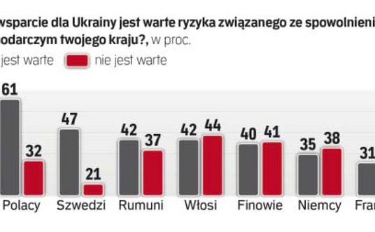 I rzeczywiście, choć w odpowiedzi na pytanie, czy mój kraj powinien przyjść Ukrainie z pomocą na wypadek rosyjskiej inwazji, opinia w większości badanych krajów jest podzielona, to przecież zaskakująco dużo osób opowiada się za solidarnością z Kijowem. To 65 proc. Polaków, 43 proc. Szwedów i Francuzów, 41 proc. Włochów, 40 proc. Rumunów i 37 proc. Włochów. Ale tylko 20 proc. Finów.