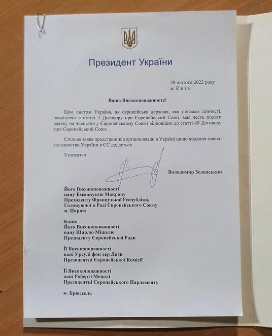 - Ukraińcy od dawna udowadniają, że wszyscy jesteśmy integralną częścią wspólnoty europejskiej. Czas przełożyć to na papier. Ukraina ubiega się o członkostwo w UE w specjalnej procedurze. Jesteśmy wdzięczni naszym partnerom za wsparcie i szybkie decyzje - głosi wydane oświadczenie.
