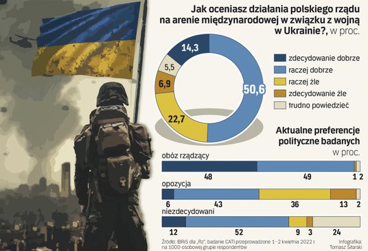 Aż 50,6 proc. respondentów sondażu IBRiS dla „Rzeczpospolitej” „raczej dobrze” ocenia działania polskiego rządu na arenie międzynarodowej w związku z wojną w Ukrainie. „Zdecydowanie dobrze” działania władz w tej kwestii ocenia 14,3 proc. respondentów, a „raczej źle” jedynie 22,7 proc. i „zdecydowanie źle” tylko 6,9 proc. badanych. Zdania nie ma jedynie 5,5 proc. respondentów.