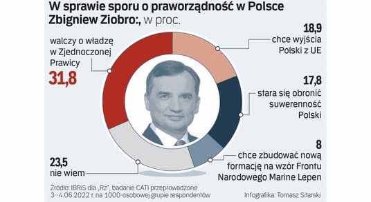 Czy lider Solidarnej Polski może więc liczyć na zrozumienie wśród wyborców? Według sondażu IBRiS największa grupa badanych uważa, że motywy, jakie przyświecają Ziobrze w sporze o praworządność, to przede wszystkim walka o władzę w Zjednoczonej Prawicy – 31,8 proc., niespełna 19 proc. uważa, że minister sprawiedliwości chce „wyjścia Polski z UE”, ale 17,8 proc. twierdzi, że stara się on obronić suwerenność kraju. 8 proc. wskazało, że chciałby zbudować formację na wzór francuskiego Frontu Narodowego Marine Le Pen.