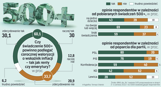 Ponad 60 proc. respondentów jest za tym, żeby świadczenie 500+ podlegało corocznej waloryzacji o wskaźnik inflacji – tak jak renty czy emerytury (30,1 proc. – „zdecydowanie tak”, a „raczej tak” – 30 proc.). Za waloryzacją są nie tylko wyborcy PiS (78 proc.), ale również PSL (aż 80 proc.), Konfederacji (59 proc.), Koalicji Obywatelskiej (42 proc.), a najmniej licznie za podwyżką opowiadają się wyborcy Lewicy (28 proc.). Przed sobotnim kongresem PiS pojawiły się informacje, że partia ogłosi waloryzację świadczenia do 700 zł. Jednak do niczego takiego nie doszło.