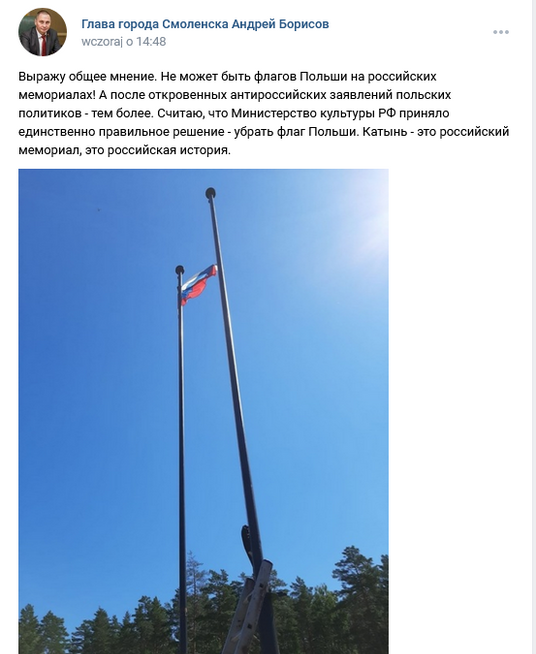 "Myślę, że Ministerstwo Kultury Federacji Rosyjskiej podjęło jedyną słuszną decyzję - zdjęcie flagi Polski. Katyń to rosyjski pomnik, to rosyjska historia" - dodał polityk.