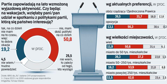 Czy to zmobilizuje obywateli i przyniesie partiom polityczne zyski? Połowa respondentów odpowiada przecząco i nie zamierza brać udziału w wydarzeniach politycznych. Ale spora grupa respondentów – 25,5 proc. – uzależnia swój udział w wakacyjnych spotkaniach od tego, kto podczas nich wystąpi. A nieco ponad 19 proc. uważa, że to dobra okazja do zainteresowania się polityką „bo na co dzień nie mam na to czasu”. 4,5 proc. nie ma w tej sprawie zdania.