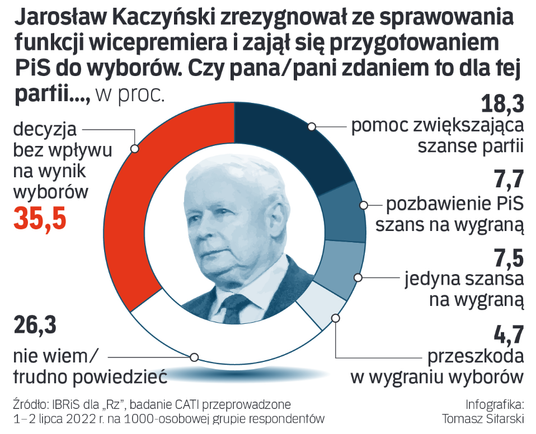 Jednak w to, że Kaczyński, skupiając się na partii, pomoże jej uzyskać lepszy wynik, nie wierzą respondenci sondażu, który przeprowadził Instytut Badań Rynkowych i Społecznych IBRiS dla „Rzeczpospolitej”. 35,5 proc. badanych powiedziało, że jest to „decyzja bez wpływu na wynik wyborów”. Odejście Kaczyńskiego z rządu „pomocą zwiększającą szanse partii” określiło 18,3 proc. Zaś za „jedyną szansę na wygraną” uznało decyzję prezesa PiS jedynie 7,5 proc.