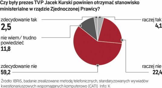 Z sondażu IBRiS dla „Rz” wynika, że Polacy nie widzą dla Jacka Kurskiego miejsca w gabinecie Mateusza Morawieckiego. Aż 59,2 proc. ankietowanych jest „zdecydowanie” przekonana o tym, że Kurski nie powinien objąć ministerialnego stanowiska. 22,4 proc. twierdzi, że „raczej” nie powinien go objąć. Tylko 2,5 proc. ankietowanych „zdecydowanie" popiera ten pomysł, 4,1 proc. „raczej” go popiera. 11,8 proc. nie ma zdania. Symptomatyczne jest to, że do Jacka Kurskiego jako ministra nie jest przekonanych aż 51 proc. aktualnych wyborców PiS.