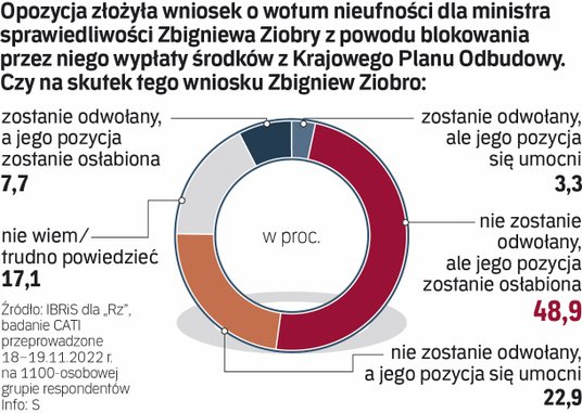 Tylko 11 proc. badanych przez IBRiS wierzy, że Zbigniew Ziobro, dzięki wnioskowi opozycji o wotum nieufności, zostanie odwołany ze stanowiska ministra sprawiedliwości. Z tego 7,7 proc. respondentów uważa, że „zostanie odwołany, a jego pozycja zostanie osłabiona”, a 3,3 proc., że „zostanie odwołany, ale jego pozycja się umocni”.