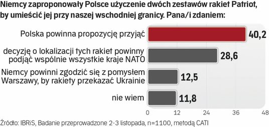 Badania pokazują, że aż 40,2 proc. ankietowanych uważa, że Polska powinna przyjąć propozycję Niemiec, aby przy granicy wschodniej ustawić baterie Patriot. Z kolei zdaniem 28,6 proc. respondentów decyzję o ich lokalizacji powinny wspólnie podjąć kraje NATO. Tylko 12,5 proc. pytanych przez IBRiS jest przekonanych, że Niemcy powinny się zgodzić z propozycją Warszawy, aby wyrzutnie przekazać do Ukrainy. Pozostali, czyli 11,8 proc., nie mają zdania.