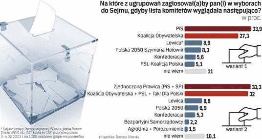 Sytuację zmienia jednak obecność samorządowców. Gdyby powstała wspólna lista KO, PSL i ruchu samorządowego Tak! Dla Polski, mogłaby liczyć na wynik prawie identyczny z tym, który uzyskuje lista Zjednoczonej Prawicy (PiS i SP). W takim wariancie 1,4 punktu procentowego traci Polska 2050, nieznacznie traci też Konfederacja, a Lewica utrzymuje niemal identyczny wynik.