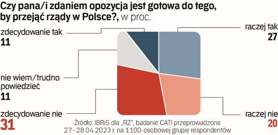 IBRiS na zlecenie „Rzeczpospolitej” zapytał respondentów, czy „opozycja jest gotowa do tego, by przejąć rządy w Polsce”. Odpowiedzi są zróżnicowane, ale nawet zwolennikom opozycji daleko do entuzjazmu. Nieco ponad 10 proc. pytanych uważa, że opozycja „zdecydowanie” jest gotowa, a 27,1 proc. uważa, że „raczej” tak. Prawie 20 proc. wskazuje, że „raczej nie”, a 31,3 proc.twierdzi, że „zdecydowanie nie”.