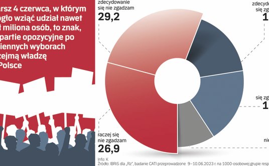 Marsz opozycji 4 czerwca zrobił duże wrażenie na wyborcach, którzy nie deklarują, na kogo i czy będą głosować. Aż 64 proc. z nich, jak wynika z sondażu IBRiS dla „Rzeczpospolitej”, uważa zdecydowanie, że „Marsz 4 czerwca, w którym mogło wziąć udział nawet pół miliona osób, to znak, że partie opozycyjne po jesiennych wyborach przejmą władzę w Polsce”. Odpowiedź „raczej tak” wskazało jeszcze 6 proc. z tej grupy. Zaskakujące, że wśród wyborców opozycji wiara w sukces marszu jest mniejsza. 22 proc. zdecydowanie się zgadza z poglądem, że wydarzenie to będzie zaczynem zwycięstwa, a 30 proc. „raczej”. Jak można się spodziewać, osoby popierające obóz rządzący nie wierzą w siłę marszu: nikt nie wskazał opcji „zdecydowanie się zgadzam”, a tylko 15 proc. wybrało „raczej się zgadzam”.