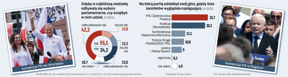 Zdaniem Dumy słabsza passa Lewicy i Trzeciej Drogi, widoczna w różnych sondażach po 4 czerwca, wynikała z walki o komisję weryfikacyjną, tzw. lex Tusk. – To już przeszłość – analizuje Duma. – Samo PiS postawiło w centrum uwagi Donalda Tuska. W ten sposób wskazało wyborcom opozycyjnym, na kogo trzeba głosować, jeśli ktoś chce się pozbyć PiS. Teraz prezes Kaczyński schował palec wskazujący za plecy i wyniki się wyrównały.