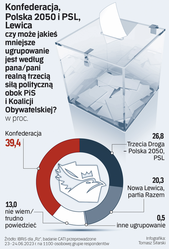 Na pytanie: „Konfederacja rośnie w sondażach, Polska 2050 i PSL stworzyły Trzecią Drogę, Lewica niezależnie buduje swoją pozycję, są też mniejsze ugrupowania. Które z ugrupowań jest wg Pana/Pani realną polityczną trzecią siłą obok PiS i Koalicji Obywatelskiej?”, aż 39,4 proc. respondentów wskazało na Konfederację. Trzecią Drogę za realną polityczną trzecią siłę uważa ledwie 26,8 proc. ankietowanych. Lewicę na najniższym miejscu podium widzi 20,3 proc. respondentów. Na „inne” ugrupowanie wskazało 0,5 proc. badanych, a 13 proc. nie potrafiło udzielić odpowiedzi.