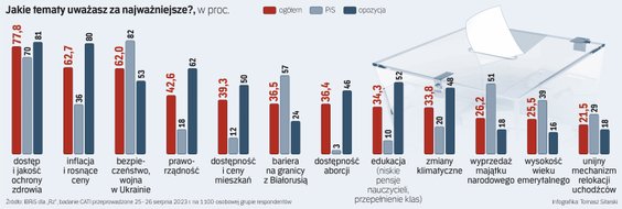Wśród zwolenników opozycji i osób niezdecydowanych temat ochrony zdrowia przebija wszystkie inne problemy – w obu grupach wskazało ją 81 proc. badanych. Na drugim miejscu jest inflacja i rosnące ceny, choć w większym wymiarze wśród wyborców opozycji (80 proc.) niż osób niezdecydowanych (60 proc.).