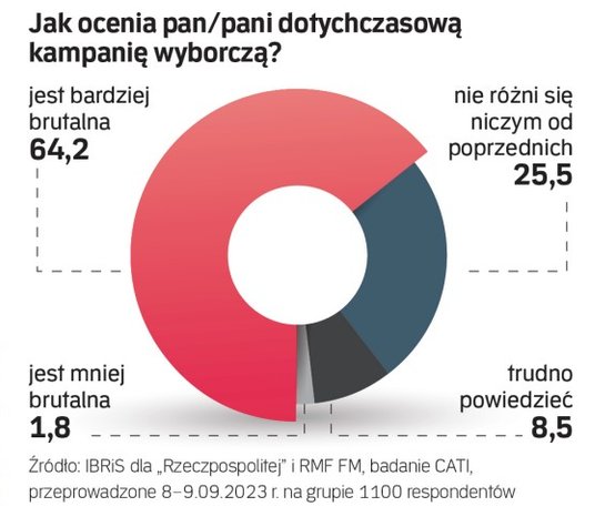 O dotychczasowy przebieg kampanii zapytaliśmy Polaków. Zdaniem 64,2 proc. badanych przez IBRiS jest ona bardziej brutalna niż poprzednie. Co czwarty badany twierdzi, że niczym nie różni się od wcześniejszych. 8,6 proc. nie ma w tej sprawie zdania, a tylko 1,8 proc. uznaje, że kampania nie jest tak ostra jak poprzednia.
