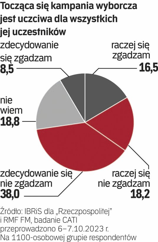IBRiS zapytał na zlecenie „Rzeczpospolitej” i RMF FM, czy zdaniem respondentów prawdziwe jest twierdzenie, iż „tocząca się kampania wyborcza jest uczciwa dla wszystkich jej uczestników”. Prawie 60 proc. badanych nie zgadza się z taką diagnozą. Nawet w grupie wyborców PiS – 24 proc. uważa, że kampania nie jest uczciwa. Wśród osób niezdecydowanych to 55 proc., a wśród zwolenników opozycji to aż 82 proc., w tym 62 proc. wskazało, że „zdecydowanie” nie zgadza się z takim twierdzeniem.