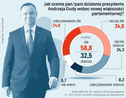 58,8 proc. Polaków źle ocenia prezydenta, a dobrze jedynie 32,5. Tylko 8,8 proc. respondentów nie ma zdania w sprawie „oceny działania prezydenta Andrzeja Dudy wobec nowej większości parlamentarnej”.