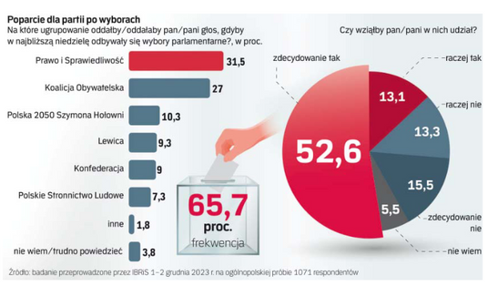 Koalicja Obywatelska także traci: w grudniu notuje poparcie 27 proc., w listopadzie było to 29,2 proc., a w wyborach uzyskała 30,7 proc. głosów.