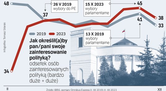 Dowodem na istnienie „mechanizmu zniechęcenia” może być porównanie zainteresowania polityką w roku 2019, kiedy odbyły się podwójne wybory (w maju europejskie, a w październiku parlamentarne), z rokiem 2023, a właściwie sezonem 2023/2024. Po październikowych wyborach na wiosnę zostaną przeprowadzone samorządowe. W 2019 roku szczyt zainteresowania polityką przypadł na okres luty–kwiecień, czyli czas przed wyborami do Parlamentu Europejskiego. Duże lub bardzo duże zainteresowanie deklarowało wtedy 48–47 proc. respondentów. Był to czas budowania opozycyjnej Koalicji Europejskiej, głośnej kampanii Wiosny Roberta Biedronia, a także szoku po morderstwie prezydenta Gdańska Pawła Adamowicza. Część wyborców uwierzyła wtedy, że zmiana jest nie tylko potrzebna, ale i możliwa. Ten nastrój nie utrzymał się jednak do dnia wyborów.