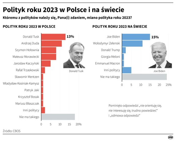 Najwięcej, bo 13 proc. ankietowanych, za polityka roku uznało lidera Platformy Obywatelskiej, premiera Donalda Tuska. Kolejne miejsce zajął Andrzej Duda — prezydenta wskazało 11 proc. ankietowanych.