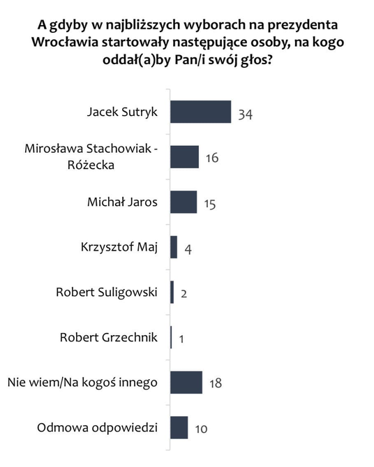 W badaniu SW Research (metoda CATI, próba z przełomu roku, 28 grudnia 2023 – 4 stycznia 2024, próba 1000 osób) prezydent Sutryk ma 34 proc. poparcia. Jeśli w tych wyborach kandydowałby też lider dolnośląskiej PO Michał Jaros, to mógłby liczyć na 15 proc. A najbardziej prawdopodobna kandydatka PiS Mirosława Stachowiak-Różecka ma 16 proc. Krzysztof Maj z Bezpartyjnych ma 4 proc., Robert Suligowski z Zielonych ma 2 proc., Robert Grzechnik z Konfederacji ma 1 proc., 18 proc. nie ma zdania, 10 proc. odmówiło odpowiedzi. Zgodnie z wynikami tego badania w II turze zmierzyłby się Sutryk i kandydatka PiS, a w mieście takim jak Wrocław oznaczałoby to praktycznie pewne zwycięstwo obecnego prezydenta. I to nawet, gdyby Sutryk kandydował samodzielnie, bez wsparcia PO.