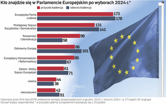 Do 2019 r. w Parlamencie Europejskim o wszystkim decydowała koalicja umiarkowanej prawicy (Europejska Partia Ludowa, EPP) i umiarkowanej lewicy (Socjaliści i Demokraci, S&D). Później musiała ona opierać swoje rządy na dokooptowaniu liberałów z Odnówmy Europę (łącznie trzy formacje miały 60 proc. głosów). Teraz pozycja i tej trójczłonowej koalicji będzie jednak zagrożona – uzyska zdaniem ECFR ledwie 54 proc. głosów.