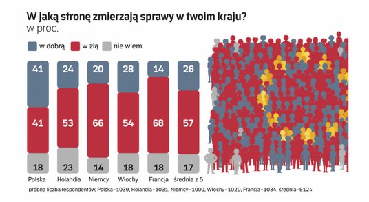 Jak podkreślają autorzy opracowania, Polska jest jedynym krajem wśród badanych, w którym utrzymuje się wysokie poparcie dla partii centrowych – w sumie 52 proc. respondentów wskazało zamiar głosowania na KO lub TD, co jest wynikiem wyższym niż w ostatnich wyborach parlamentarnych. We Francji natomiast wygrywa Front Narodowy z 33 proc. poparcia, w Holandii radykalnie prawicowa i antyislamska Partia Wolności – 25 proc. poparcia, we Włoszech pierwsze miejsce zajmują Bracia Włosi z 28-proc. wynikiem. W Niemczech co prawda pierwsze miejsce zajmuje centroprawicowa CDU – 29 proc., ale na drugim miejscu plasuje się AfD z 17 proc., która przeskakuje SPD.