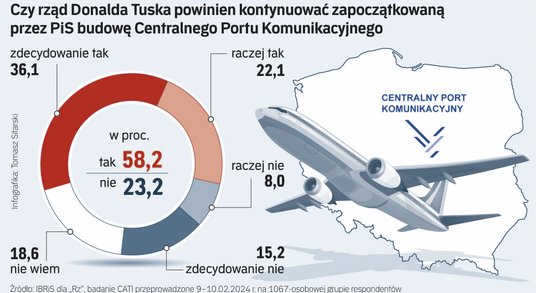 Zgodnie z wynikami sondażu 36,1 proc. ankietowanych „zdecydowanie” opowiada się za kontynuacją przedsięwzięcia. 22,1 proc. „raczej” tego chce – łącznie jest to 58,2 proc. Przeciwników CPK jest mniej. 8 proc. „raczej” nie zgadza się z tym, by dalej budowano lotnisko, a 15,2 proc. nie chce tego w zdecydowany sposób, łącznie – 23,2 proc. Uwagę zwraca duża liczba niezdecydowanych co do losów przedsięwzięcia. W tym badaniu nie ma zdania 18,6 proc. ankietowanych.
