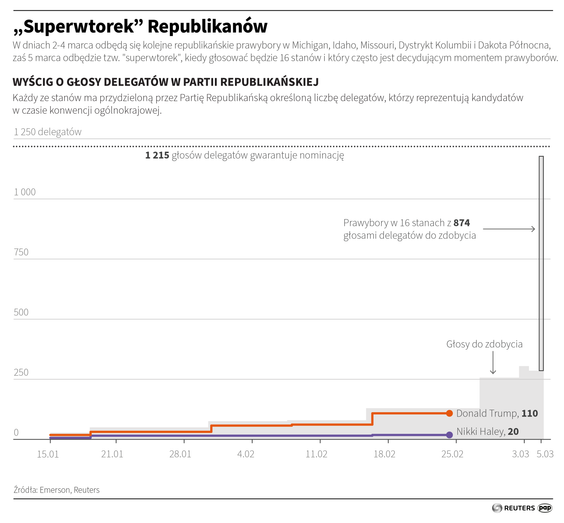 Trump praktycznie ma nominację w kieszeni. Komentatorzy nie spodziewają się żadnych niespodzianek 5 marca, gdy do głosowania pójdą republikanie w 15 stanach oraz jednym terytorium. Wybrana zostanie wówczas jedna trzecia delegatów republikańskich.