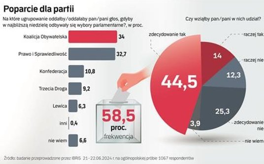 – To kolejne potwierdzenie naszego systemu partyjnego. Przemiany w nim mają charakter ewolucyjny i nie naruszają struktury całości – tak prof. Rafał Chwedoruk, politolog z UW, komentuje najnowszy sondaż IBRiS przeprowadzony dla „Rzeczpospolitej”. Wyniki badania zbliżone są do rezultatu wyborów europejskich. Szczyt podium zajmuje formacja Donalda Tuska, za którą ulokowało się ugrupowanie Jarosława Kaczyńskiego. Z kolei trzecie miejsce należy do umacniającej się Konfederacji, a dopiero za nią, z jednocyfrowym poparciem, lokuje się Trzecia Droga.