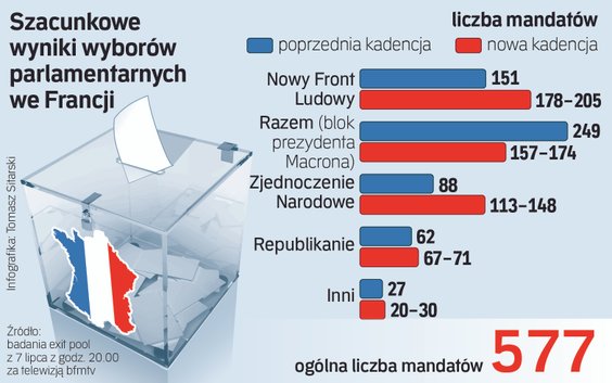 Przeprowadzona 30 czerwca pierwsza tura wyborów parlamentarnych we Francji zakończyła się zwycięstwem Zjednoczenia Narodowego. Partia Marine Le Pen uzyskała 33,2 proc. głosów i wyprzedziła lewicowy Nowy Front Ludowy (28,1 proc.) i Razem dla Republiki, koalicja partii prezydenta Macrona i sojusznicy (21,2 proc.).