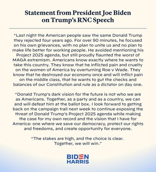 Prezydent zauważa, że Trump podczas swojego wystąpienia nie zająknął się o Projekcie 2025 (programu następnej ewentualnej kadencji Trumpa, przygotowanego przez ultrakonserwatywną Heritage Foundation) - red.), "ale nadal z dumą obnosił się z najgorszymi ekstremizmami MAGA".