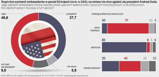 IBRiS na zlecenie „Rzeczpospolitej” zapytał, kto ma rację w sporze w związku z zamiarem odwołania przez rząd 50 ambasadorów, na co nie zgadza się prezydent RP Andrzej Duda. Prezydent tłumaczy, że można ich odwoływać przed upływem kadencji tylko z powodów merytorycznych, nie zaś politycznych.
