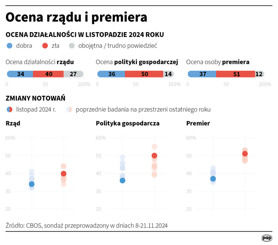W badaniu CBOS zapytano ankietowanych, jak oceniają rząd i premiera Donalda Tuska. W listopadzie liczba pozytywnych ocen rządu pozostała bez zmian lub zmieniła się nieznacznie. Wzrosły odsetki głosów krytycznych, a opinie o rządzie po raz kolejny minimalnie się pogorszyły.