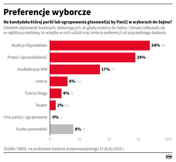 Na podium znalazła się też Konfederacja Wolność i Niepodległość, której liderami są Sławomir Mentzen i Krzysztof Bosak (17 procent, wzrost od początku lutego o 4 punkty procentowe). Konfederacja osiągnęła najlepszy wynik od czasu sondaży przed wyborami parlamentarnymi w 2023 roku.