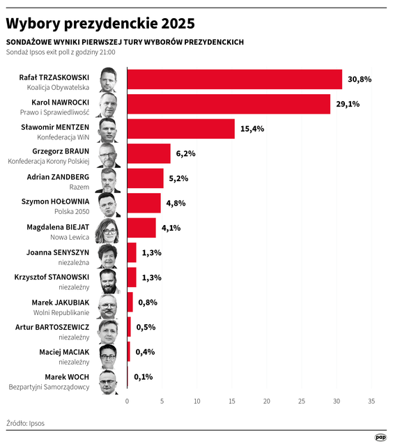 Rafał Trzaskowski zdobył 31,36 proc. głosów, Karol Nawrocki – 29,54 proc., Sławomir Mentzen – 14,81 proc., Grzegorz Braun – 6,34 proc., Szymon Hołownia – 4,99 proc., Adrian Zandberg – 4,86 proc., Magdalena Biejat – 4,23 proc.