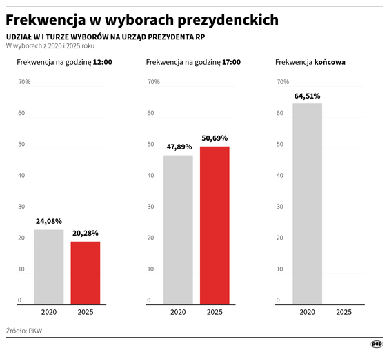 Państwowa Komisja Wyborcza podała najnowsze dane o frekwencji, z których wynika, że w wyborach zagłosowało więcej osób niż o tej same porze podczas pierwszej tury wyborów prezydenckich w 2020 r.