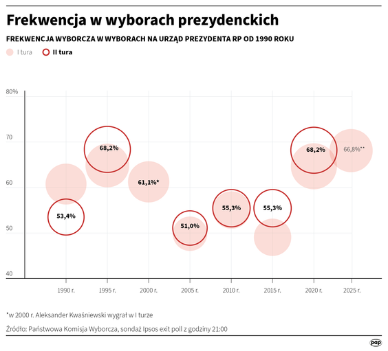 Frekwencja w wyborach prezydenckich w Polsce po 1990 roku wahała się od 48,96 proc. (I tura w wyborach z 2015 roku) do 68,23 proc. (II tura w wyborach z 1995 roku). Najwyższą frekwencję w wyborach organizowanych w Polsce po 1990 roku zanotowano w wyborach parlamentarnych z 2023 roku, gdy do urn poszło 74,38 proc. Polaków.