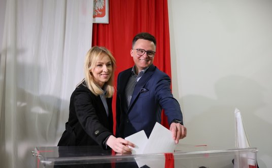 Przewodniczący Trzeciej Drogi Szymon Hołownia z żoną Urszulą głosowali w lokalu wyborczym w Otwocku.