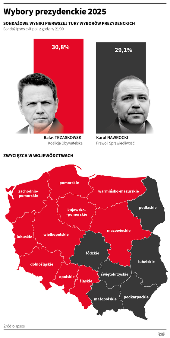 Sondaż exit poll przygotowany przez Ipsos dla TVP, TVN i Polsatu wskazuje, że w drugiej turze zmierzą się Rafał Trzaskowski i Karol Nawrocki