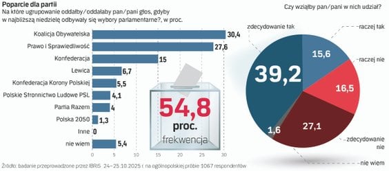 13 listopada 2025 r. minie dokładnie połowa kadencji obecnego parlamentu. W jakiej sytuacji znajdują się najważniejsze siły polityczne przed jej drugą częścią? PiS i Koalicja Obywatelska od miesięcy w badaniach IBRiS dla „Rzeczpospolitej” zamieniają się miejscami na pierwszym miejscu i utrzymują do siebie niewielki dystans. Nie inaczej jest w najnowszym sondażu – tym razem to Koalicja Obywatelska zdobywa przewagę nad PiS. KO może liczyć na 30,4 proc. (o 1,7 pkt proc. więcej niż pod koniec września) a PiS na 27,6 proc. (spadek o 0,5 pkt proc.). Miesiąc temu obydwie partie w zasadzie remisowały. Sondaż przeprowadzono w dniach 24-25 października, czyli w trakcie „politycznego superweekendu”, w którym doszło do zapowiadanej od dawna konsolidacji PO z Nowoczesną i Inicjatywą Polską, a co za tym idzie oficjalnego powstania partii Koalicja Obywatelska. Politycy KO zapowiadają zresztą, że to nie koniec ekspansji. A nastroje w ugrupowaniu Donalda Tuska – jak wynika z kuluarowych rozmów „Rzeczpospolitej” – są bardziej optymistyczne niż pod koniec wakacji i na pewno lepsze niż po wyborczej porażce Rafała Trzaskowskiego.